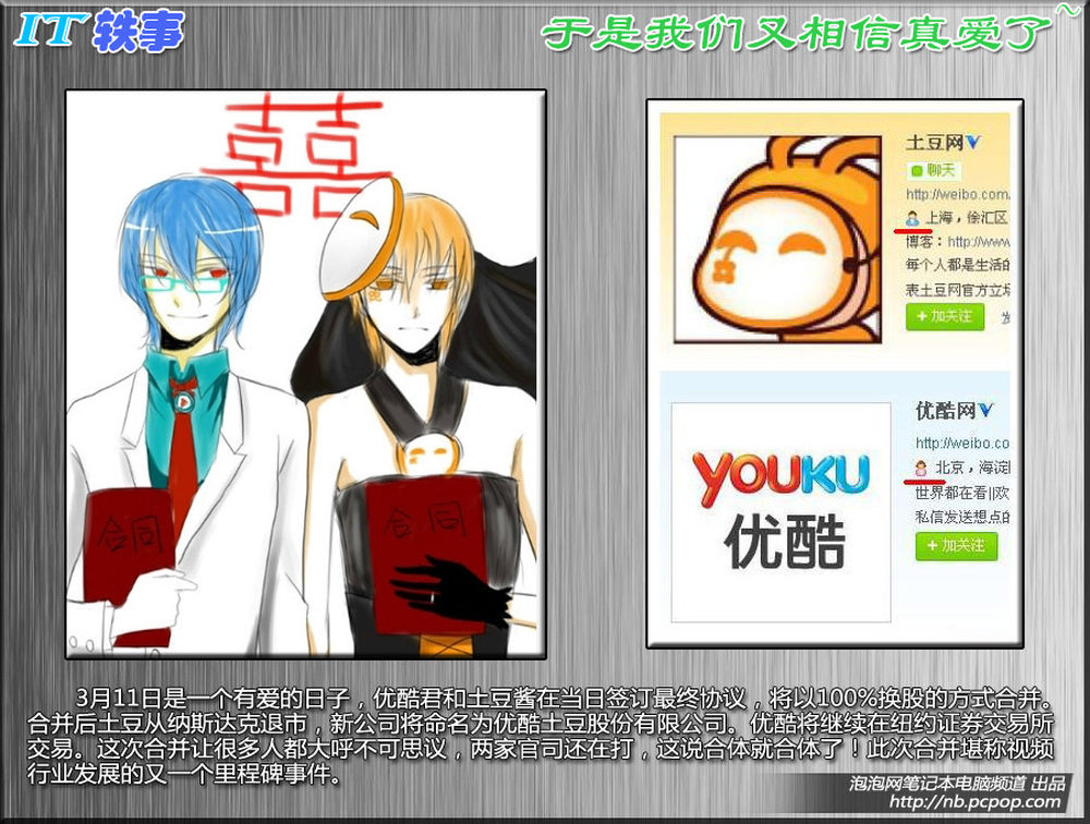 3月11日是一个有爱的日子,优酷君和土豆酱在当日签订最终协议,将以100%%换股的方式合并。合并后土豆从纳斯达克退市,新公司将命名为优酷土豆股份有限公司。优酷将继续在纽约证券交易所交易。这次合并让很多人都大呼不可思议,两家官司还在打,这说合体就合体了!此次合并堪称视频行业发展的又一个里程碑事件。4/10