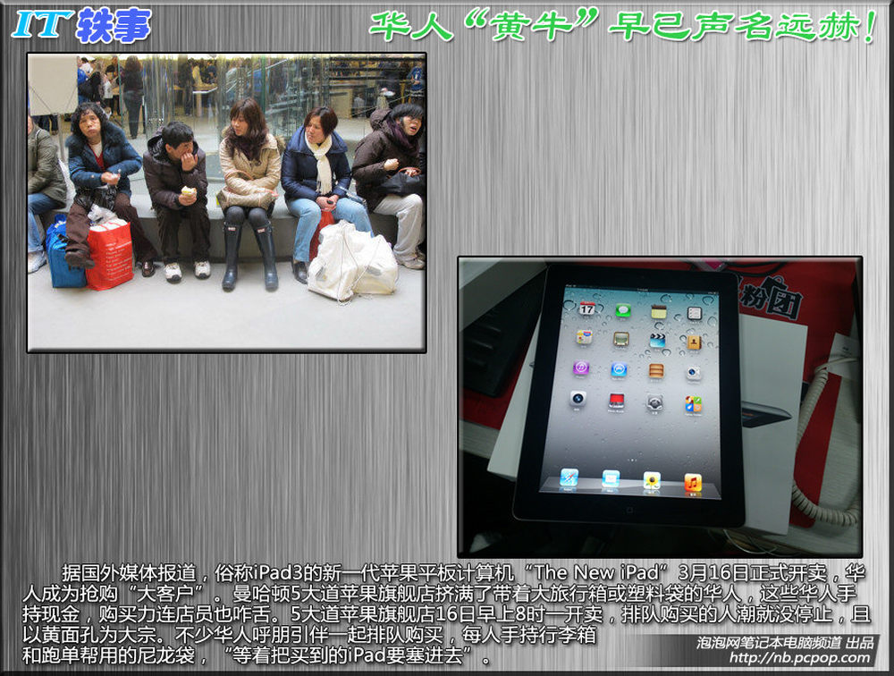 据国外媒体报道,俗称iPad3的新一代苹果平板计算机“The New iPad”3月16日正式开卖,华人成为抢购“大客户”。曼哈顿5大道苹果旗舰店挤满了带着大旅行箱或塑料袋的华人,这些华人手持现金,购买力连店员也咋舌。5大道苹果旗舰店16日早上8时一开卖,排队购买的人潮就没停止,且以黄面孔为大宗。不少华人呼朋引伴一起排队购买,每人手持行李箱和跑单帮用的尼龙袋,“等着把买到的iPad要塞进去”。5/10