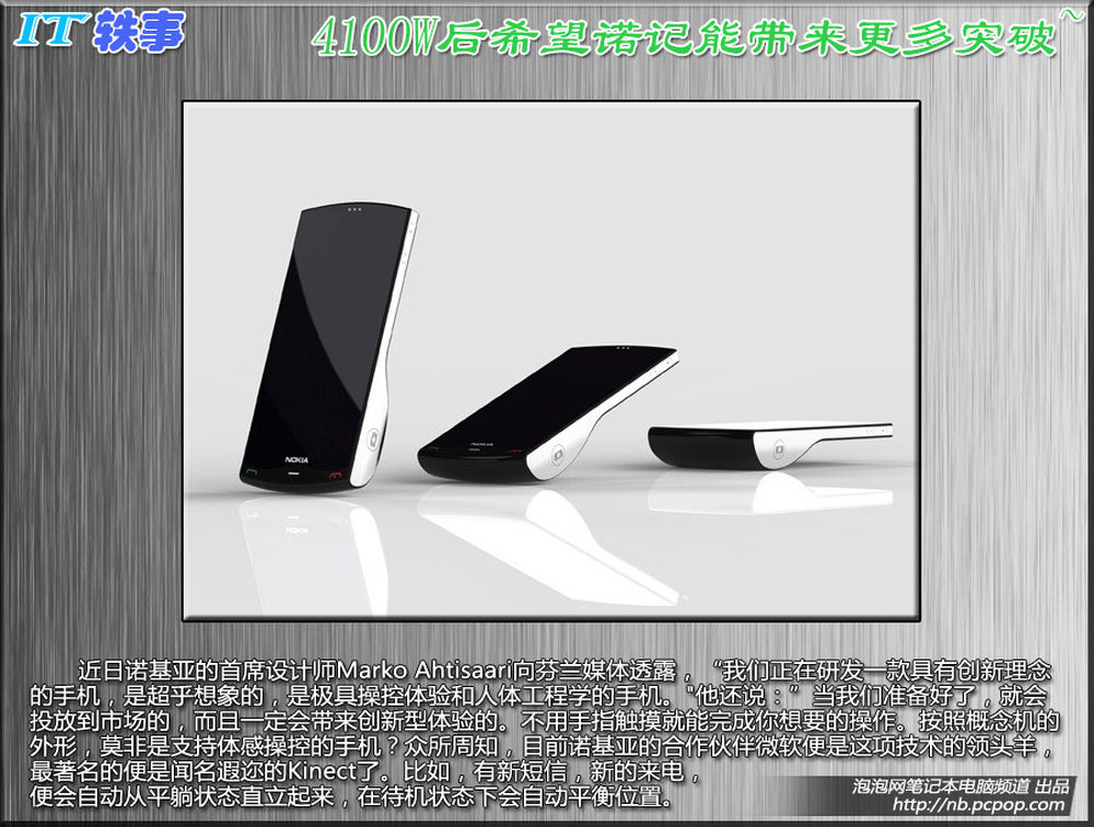 近日诺基亚的首席设计师Marko Ahtisaari向芬兰媒体透露,“我们正在研发一款具有创新理念的手机,是超乎想象的,是极具操控体验和人体工程学的手机。"他还说:”当我们准备好了,就会投放到市场的,而且一定会带来创新型体验的。不用手指触摸就能完成你想要的操作。按照概念机的外形,莫非是支持体感操控的手机?众所周知,目前诺基亚的合作伙伴微软便是这项技术的领头羊,最著名的便是闻名遐迩的Kinect了。比如,有新短信,新的来电,便会自动从平躺状态直立起来,在待机状态下会自动平衡位置。6/10