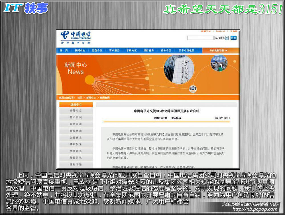 上周,中国电信对央视315晚会曝光问题开展自查自纠:中国电信集团公司对央视315晚会曝光的垃圾短信问题高度重视,已成立专门小组对曝光涉及的违反集团公司相关规定的基层企业进行认真调查处理。中国电信一贯反对垃圾短信,整治垃圾短信的态度是坚决的。对于发现的问题,我们将坚决处理,绝不姑息,并将以此为契机,在全集团范围内开展严肃的自查自纠,努力为用户创造良好的信息服务环境。中国电信真诚地欢迎、感谢新闻媒体、广大用户和社会各界的监督。8/10