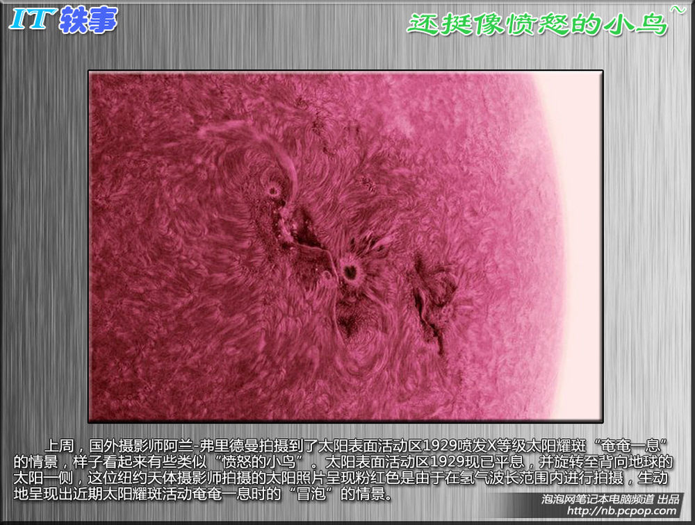 上周,国外摄影师阿兰-弗里德曼拍摄到了太阳表面活动区1929喷发X等级太阳耀斑“奄奄一息”的情景,样子看起来有些类似“愤怒的小鸟”。太阳表面活动区1929现已平息,并旋转至背向地球的太阳一侧,这位纽约天体摄影师拍摄的太阳照片呈现粉红色是由于在氢气波长范围内进行拍摄,生动地呈现出近期太阳耀斑活动奄奄一息时的“冒泡”的情景。10/10