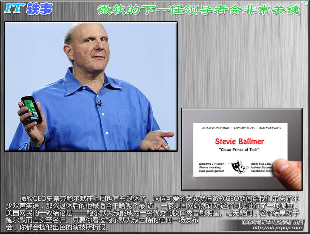 微软CEO史蒂芬鲍尔默在上周也宣布退休了。这位可爱的大叔就任微软CEO期间给我们带来了不少欢声笑语,那么退休后的他最适合干啥呢?最 近,一家美国网站就针对这个问题进行了一项调查,美国网民的一致结论是——鲍尔默大叔能成为一名优秀的脱口秀喜剧明星。毫无疑问,这个结果对于鲍尔默而言实至名归。只要你看过鲍尔默大叔主持的任何一场发布会,你都会被他出色的演技所折服。