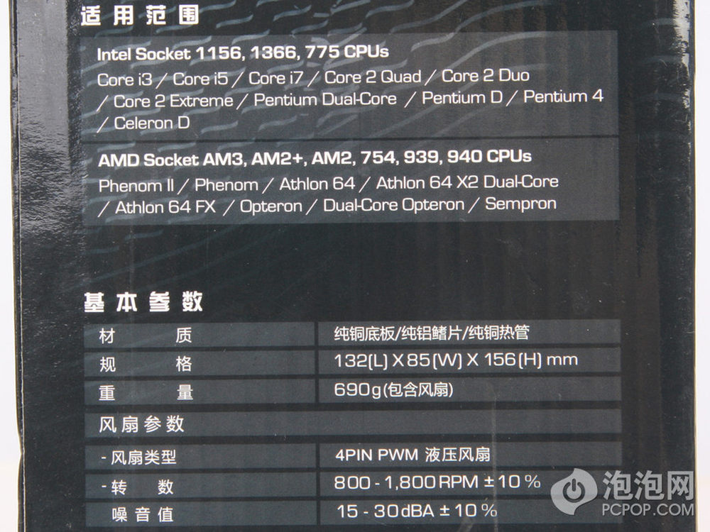 散热器的包装规规矩矩,其中有几个特点标注在最下一行: