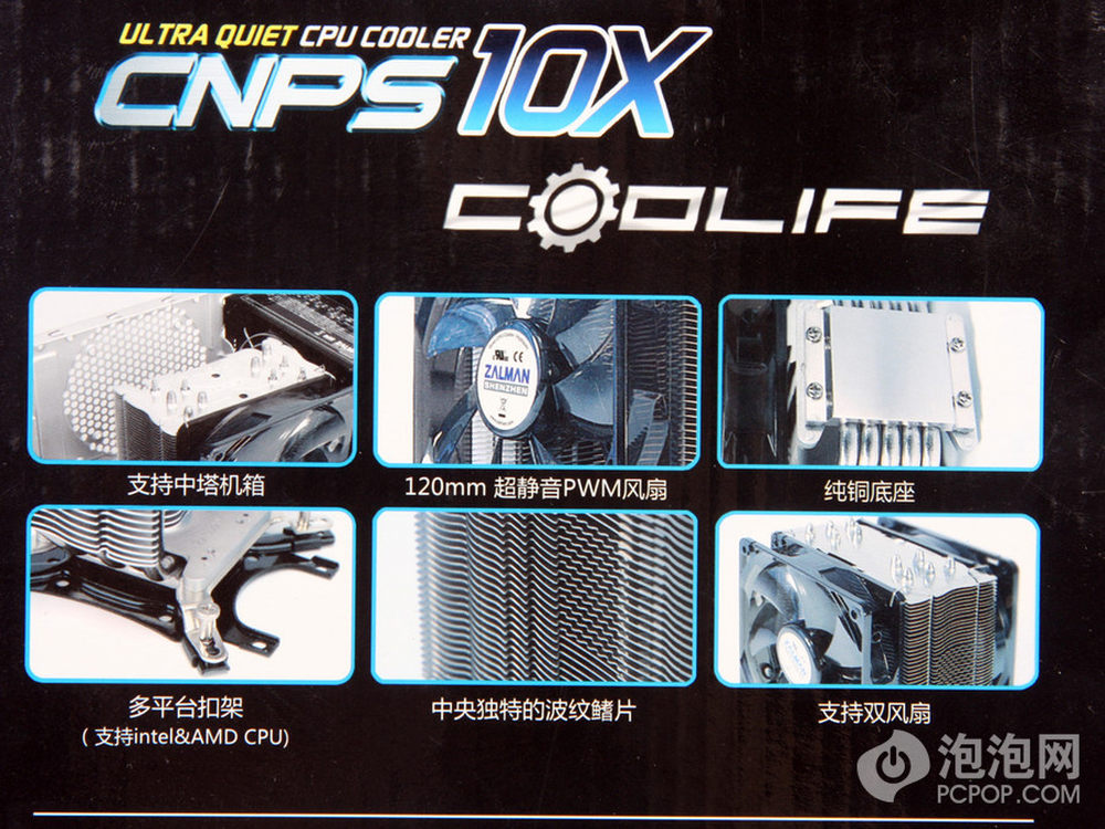 在包装上详细介绍了散热器的特点,这些特点和包装盒正面下侧的一致。我们可以留意下,CNPS10X除了这个Coolife版还有一个泰坦版。从包装到散热器都有较多区别,那个只有4根热管。5/20