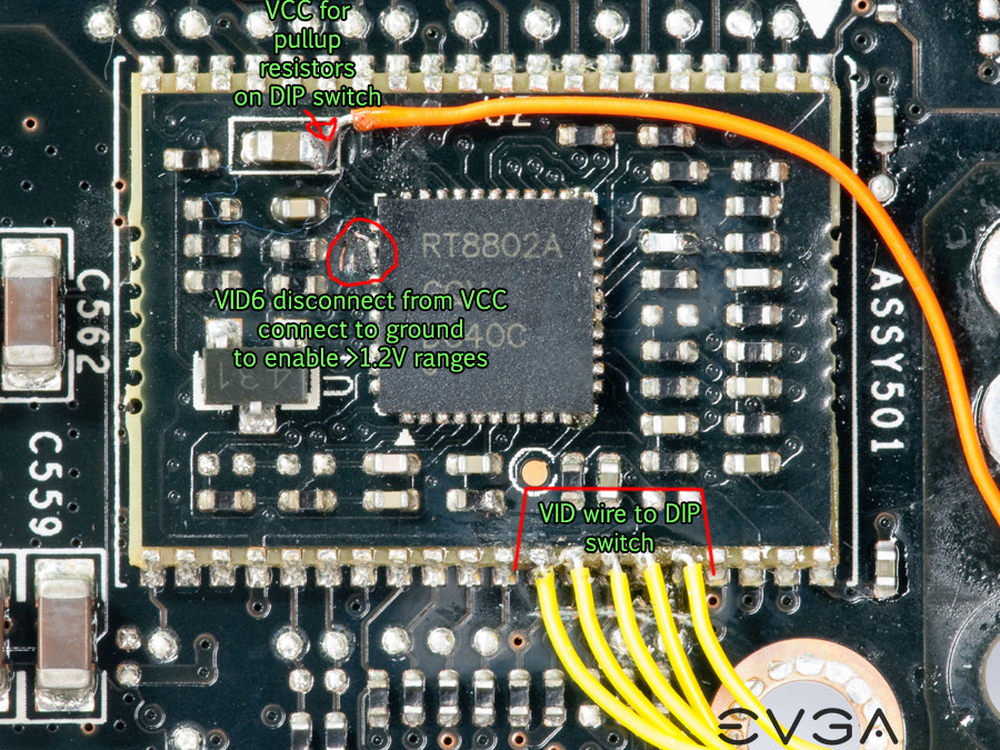 由于要大幅超频GPU,所以核心需要更高的电压,需要对RT8802A芯片进行DIP转换,获得更高的电压。11/21