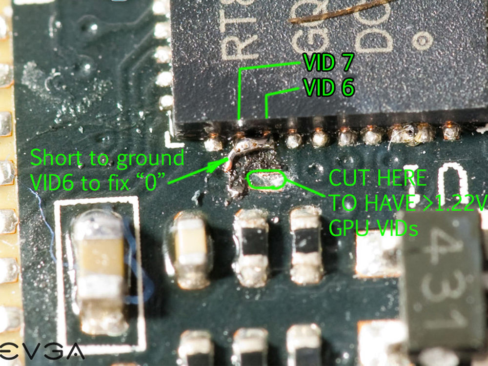 默认NVIDIA官方限制的电压为1.21V,此电压下超频幅度表现非常一般。而只要断开VID6与VCC的连接,手动将其连接GND就可以获得更高的电压。12/21