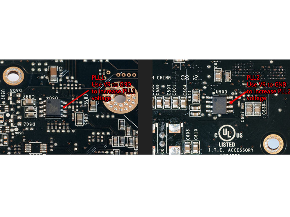 改造完GPU和显存供电后,接下来对PLL进行改造,改造也很简单,分别将PLL1、PLL2的VR接地就可以了。16/21