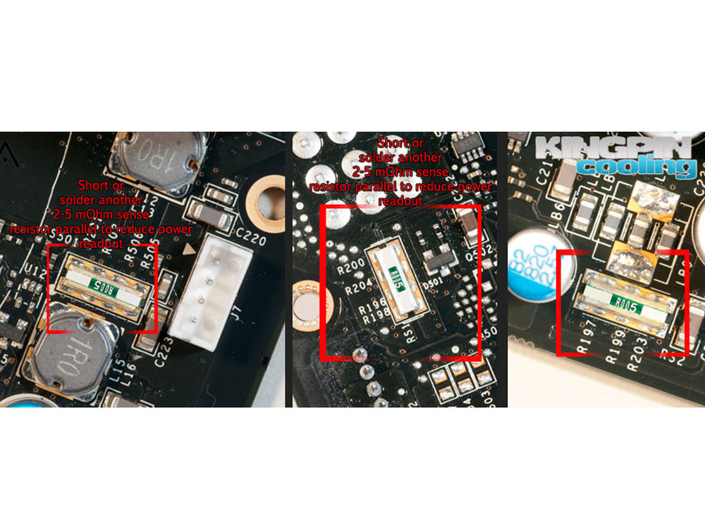 最后就剩下电路保护的解除了,公版显卡为了安全起见,设置了多个过热保护,而破解要做的工作就是移除这些电阻。公版GTX 680使用了3颗5mΩ电阻,当显卡的功耗上升到一定程度时,电阻就会升温至限制临界点,而你要做的就是把这3个电阻短接,或者是并联、或者替换这颗电阻就可以了。17/21