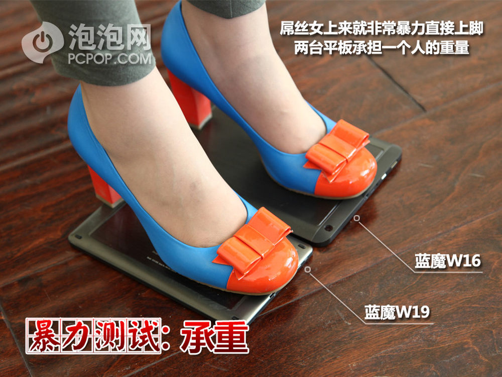 暴力测试主要由“屌丝女”与“高富帅”两位配合执行,这不才刚刚开始就是暴力的高跟鞋承重测试,可怜的平板啊!3/29