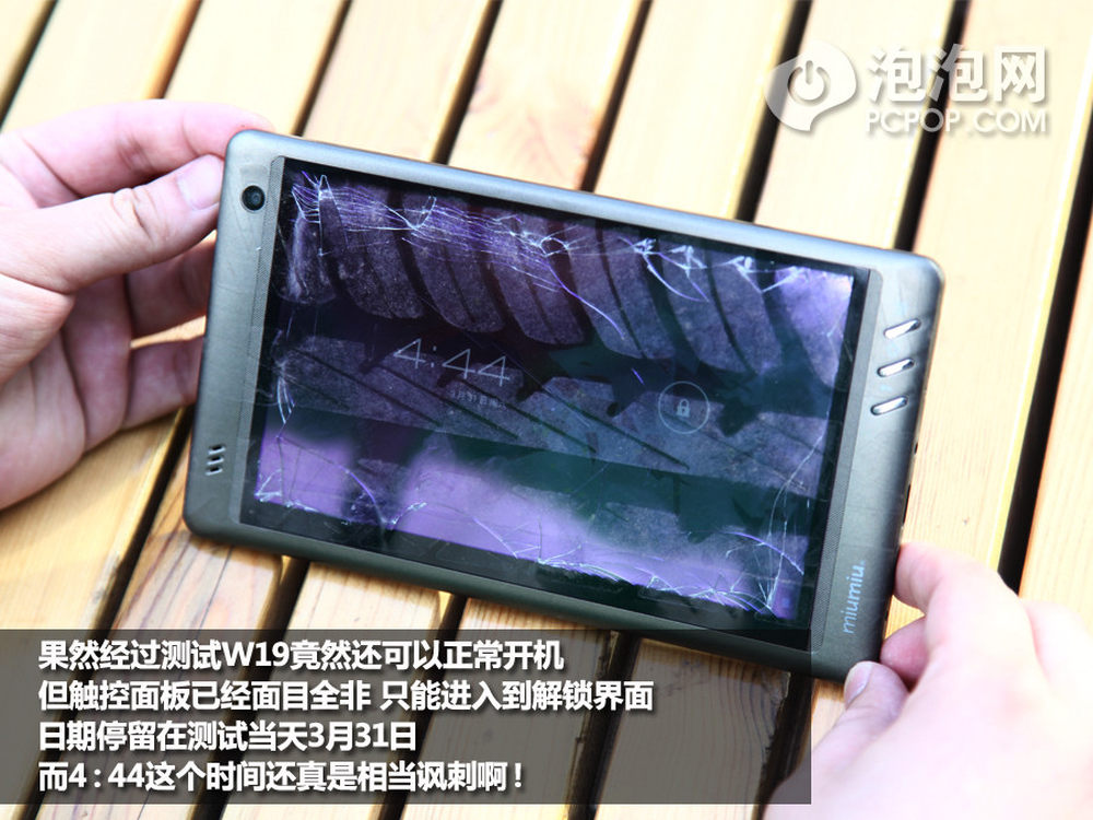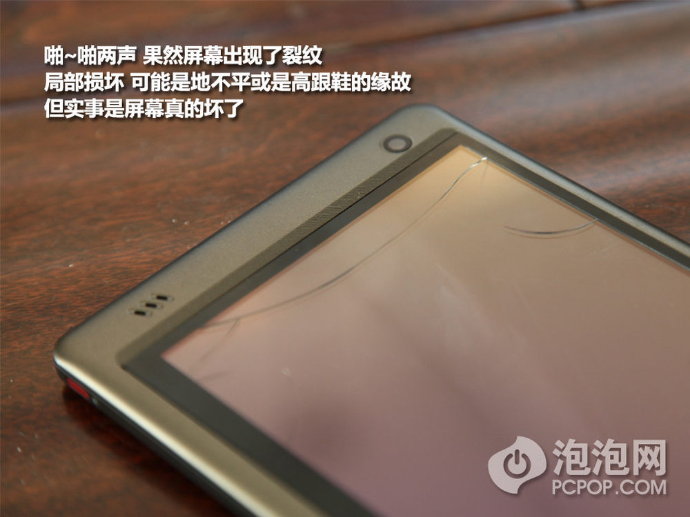 伴随着碎裂的声音,这款蓝魔W19平板电脑成为了第一台暴力测试牺牲品,屏幕面板碎裂。当然,这可能与高跟鞋或地面不平等种种因素有关,但实事是它的部分屏幕碎裂了。8/29