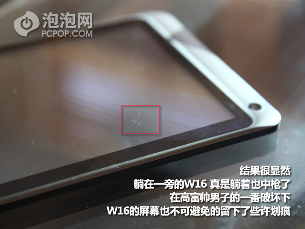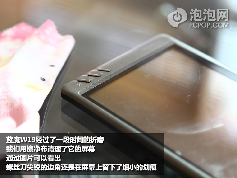 可以看到蓝魔W19的屏幕经受过洗礼后,屏幕出现了细小的划痕,看来不是金刚屏确实有差距啊!15/29