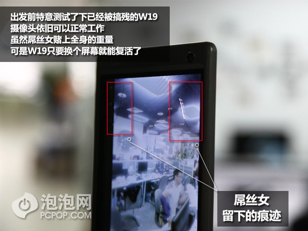 中途特别测试了下,屏幕面板已经损坏了的W19。由于当时的测试屏幕出现的碎裂声,但谁也不知道这款平板电脑还能否正常使用。所以我们简单的测试了下这款平板,可以看到之前承受高跟鞋压力的摄像头依旧可以正常运转。20/29