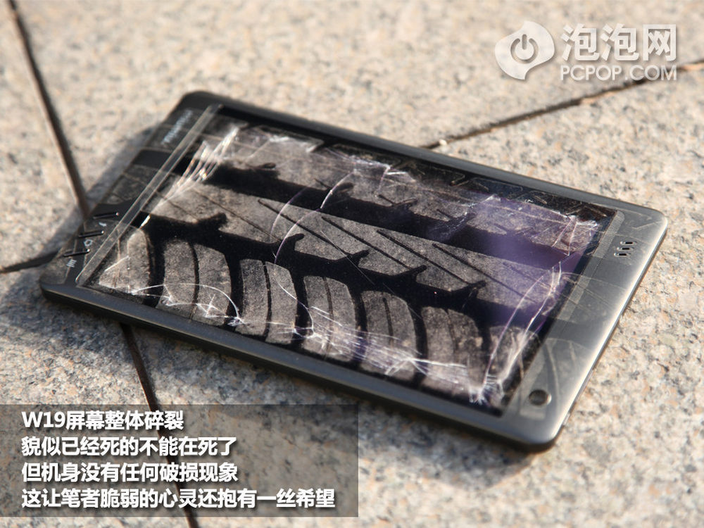 嘎巴~嘎巴~嘎巴!一阵声音过后,这蓝魔W19的显示屏已经面目全非了。结果却是出乎意料,虽然屏幕完蛋了,但机身却没有任何损伤。这样的情况非常少见,将近一顿半的重量竟然没有让机身发生破裂。22/29