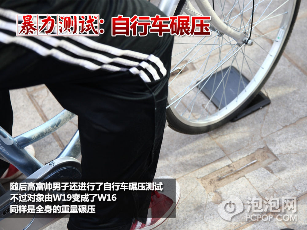 不死心的“高富帅”男子还想用自身的重量,配合自行车受力面积较小的车轱辘对W16进行碾压测试。25/29