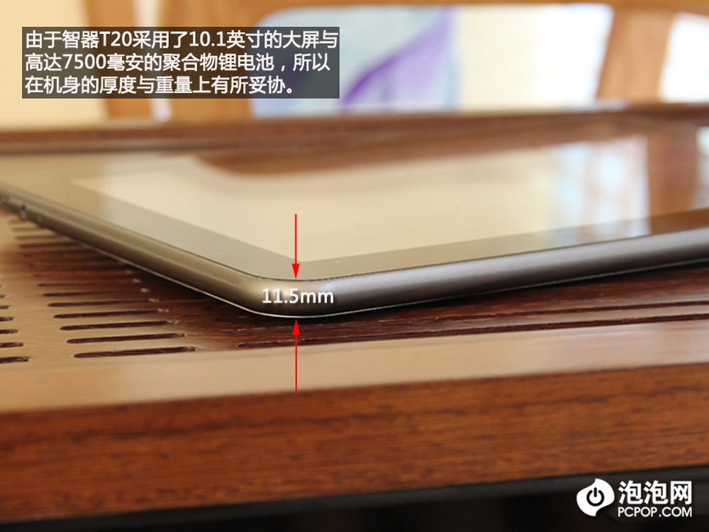 由于智器T20采用了10.1英寸的大屏与高达7500毫安的聚合物锂电池,所以在机身的厚度与重量上有所妥协,不过也和目前的主流水平相当。7/12