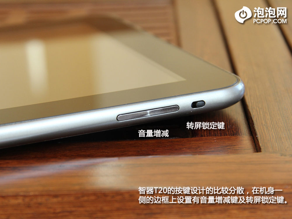 智器T20的按键设计的比较分散,在机身一侧的边框上设置有音量增减键及转屏锁定键,并且金属按键非常有质感,手感不错。10/12