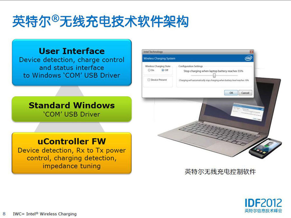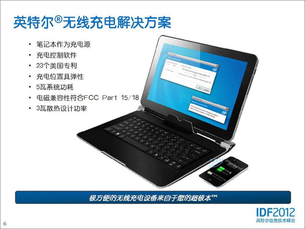 Intel的无线充电技术解决方案是用超极本作为充电源,配合充电软件和发射端能方便为智能手机充电,这一方案不仅系统功耗较低,而且对智能手机的摆放位置几乎没有要求。5/12