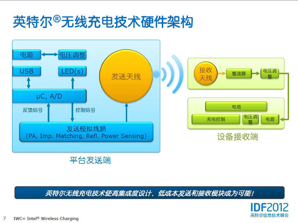 上图为Intel无线充电技术硬件架构,从图中可以看出,发送端和接收端均采用了高集成度设计,这样一来有效降低了制造成本。6/12