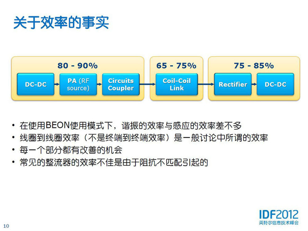 Intel无线充电技术采用了谐振技术,具备可与电磁感应相匹配的效率,一般说的是指线圈到线圈的效率,而实际中的效率则包括上图中的整个流程。9/12