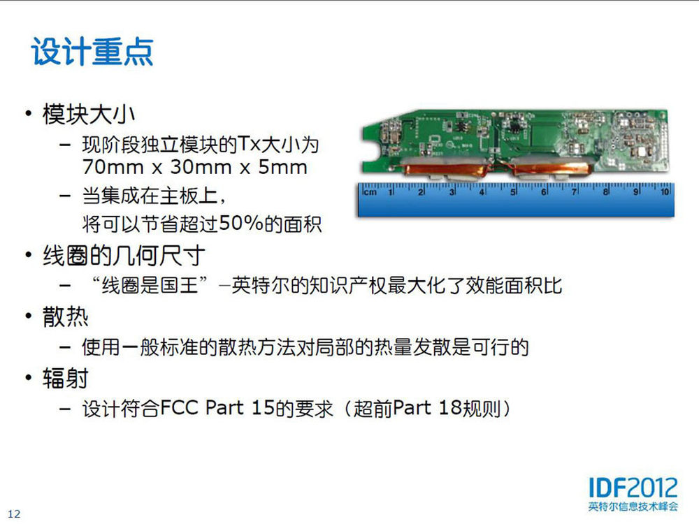 Intel无线充电技术采用高集成度的模块设计,这样可以将线圈的尺寸控制在最小,以最大化效能面积比,而且发热量也控制在一定范围,模块的辐射也符合FCC Part15的要求,在安全范围。11/12