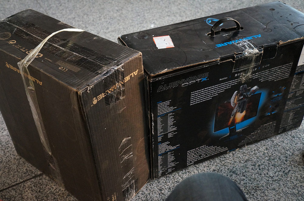 见过出差的,但你见过拎着一套完整台式机出差的吗?没办法,客户要求的,那我们就去满足。右边大箱子是装显示器的,23英寸,左边是主机,好在Alienware X51只有10L大小,并不是很沉,箱子也不是很大。不过,这次长记性了,下次用胶带做提手的时候,一定要在这里塞点儿报纸之类的,否则勒手。3/45