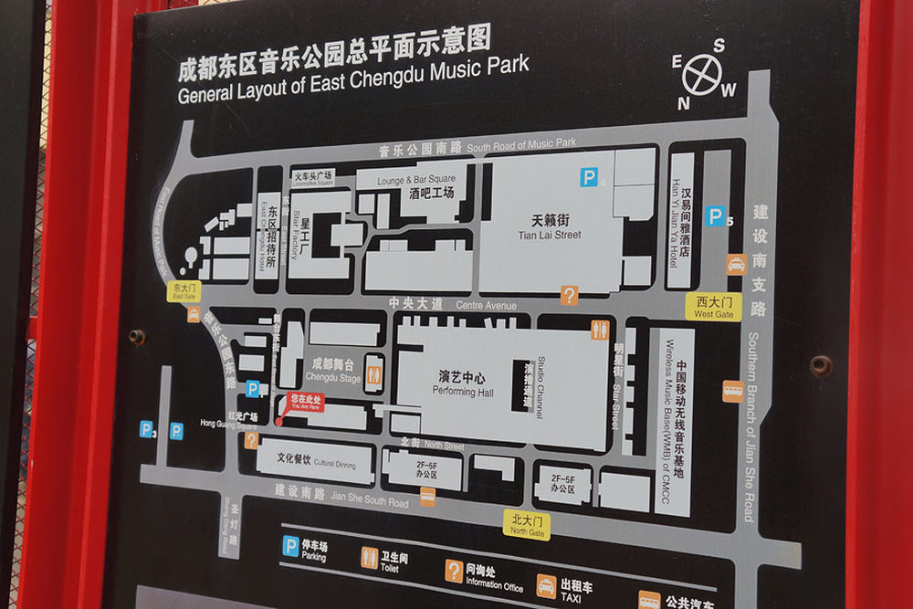 音乐公园平面示意图,这张是在东门附近拍的。公园不是很大,有两三个小时就可以彻底逛一遍。不过还是干正事要紧,去赛场。8/45