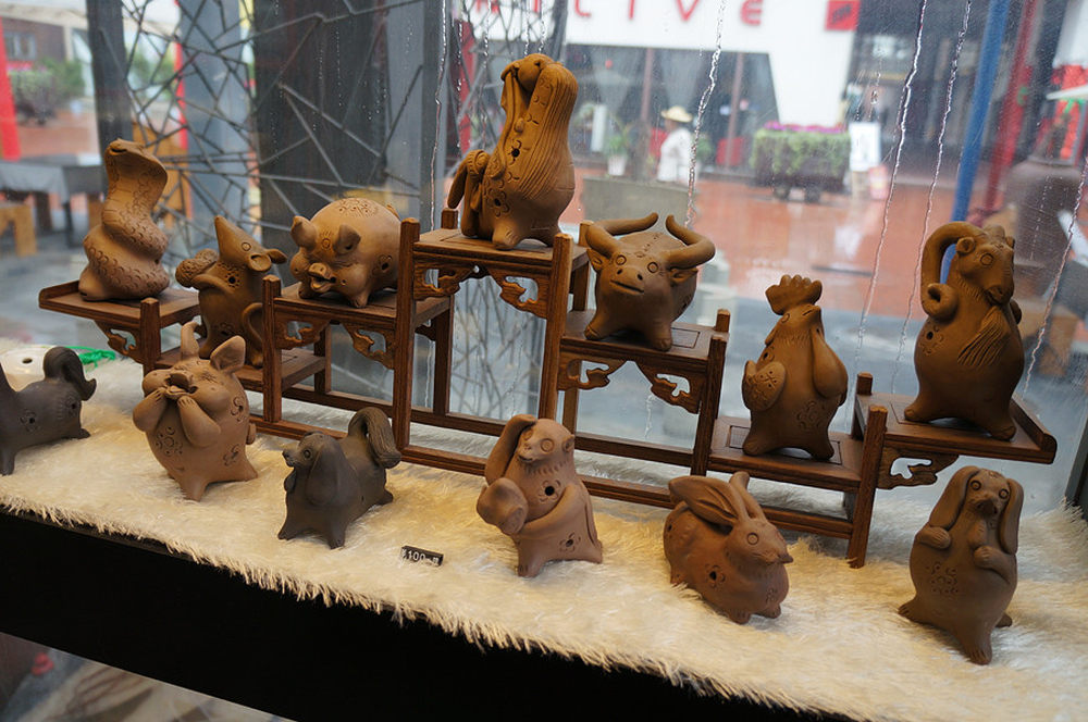 陶制的十二生肖,尤以那个高高在上的龙最讨喜。下面也标注了价格,只是不知道这100元是不是指的单个,要真是下来一整套,未免也有点儿不保本啊。23/45