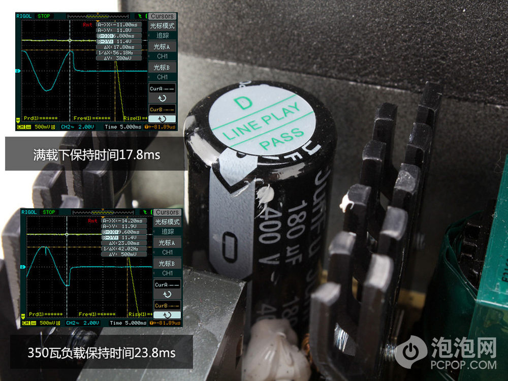 满载下测试保持时间就达到了Intel的电源规范,在350瓦负载时(77.8%%负载)更多一些,达到了23.8ms,而Intel只要求18ms,所以主电容容量还是够的。