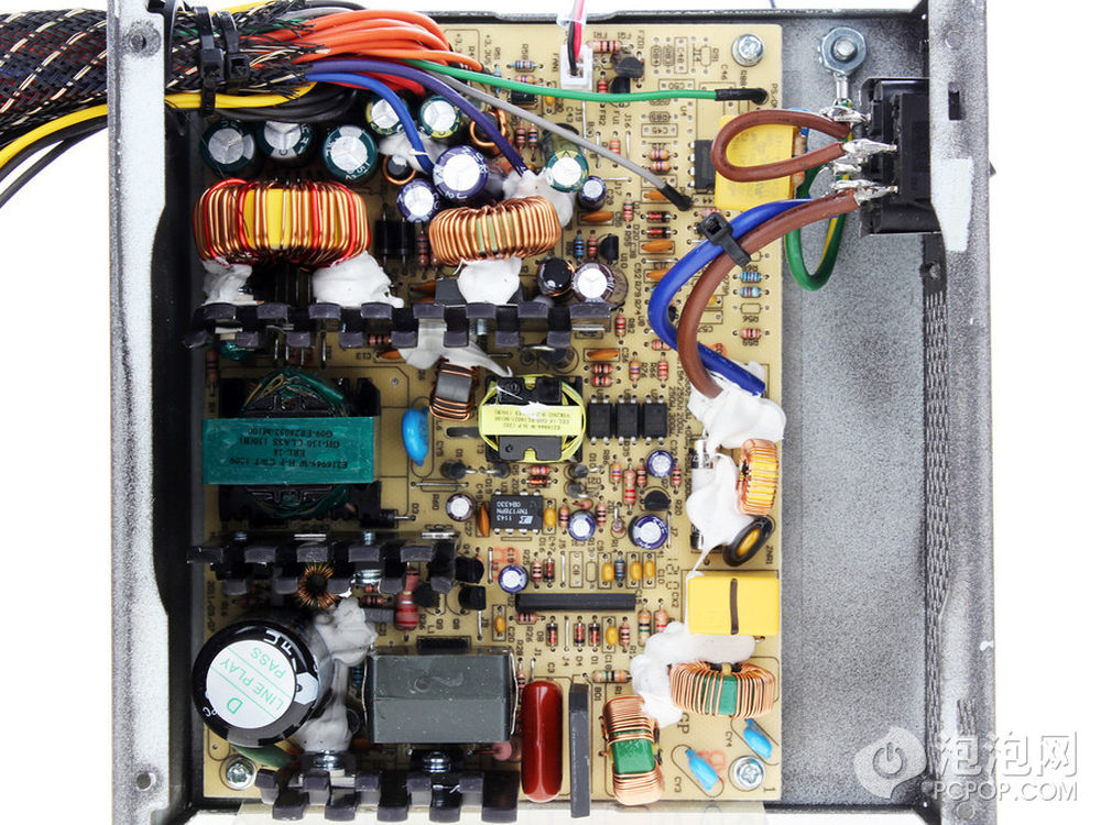 电源采用了CM6805控制的主动式PFC 双管正激开关,二次侧3.3V单路磁放大,输出电容来自国产品牌JunFu,线材根部箍了金属环也套了热缩管,做工比较规范。11/11
