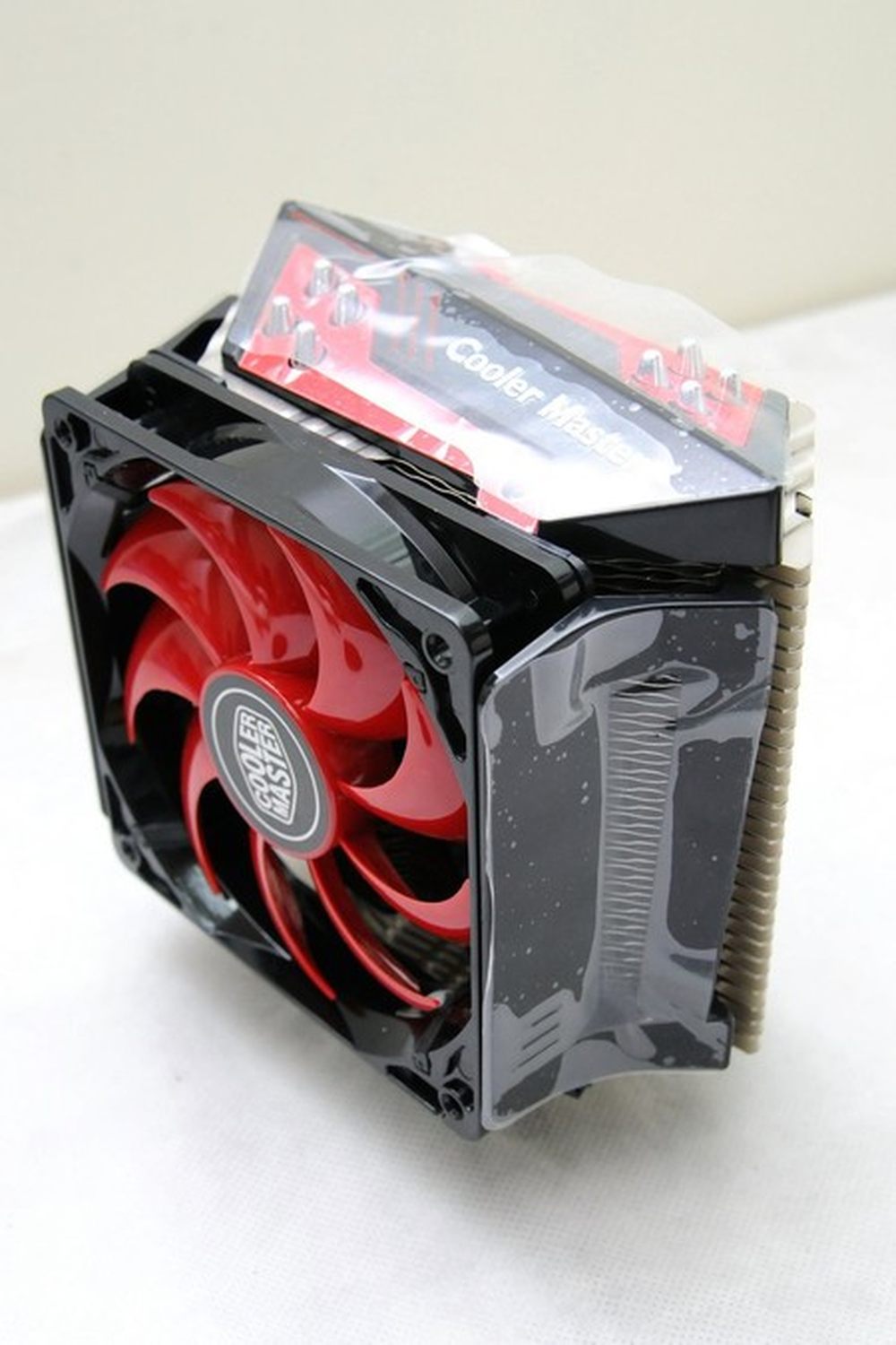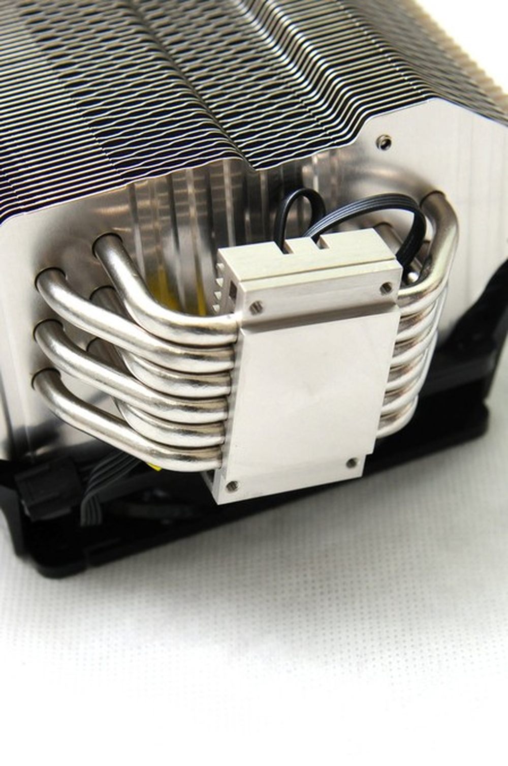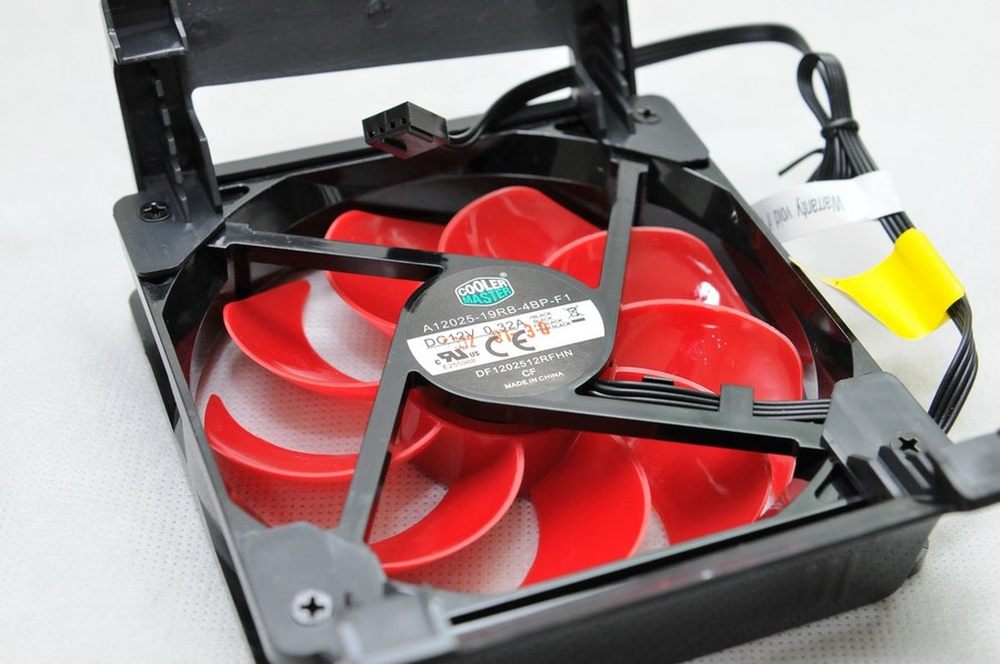 可以看到酷冷X6通过标准的12厘米风扇孔位给风扇加装了一个风扇罩,通过它我们才能将风扇固定到鳍片上。酷冷X6风扇转速调节范围要比常见风扇大一些,600-1900RPM意味着风扇拥有更静音或是更加强悍的性能,接近2000RPM的高转速为吹透鳍片提供了可能。7/12
