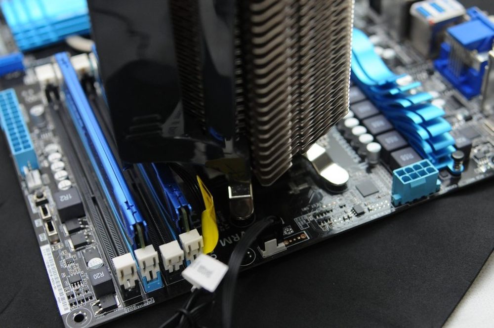 实际测试时shadowsfall选用的是LGA2011平台,可能是为了展示普通4槽内存条主板兼容性他额外将散热器安装到了AMD平台。可以看到X6的测斜结构让凸起一面的风扇与内存垂直分布了,不过各位不用担心,普通高度的内存不会存在问题。11/12