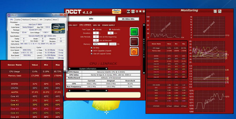 测试时shadowsfall选用华擎X79 Extreme 9主板搭配i7 3960X处理器进行测试,并且将处理器超频至4.5GHz,在环境温度22摄氏度的情况下,酷冷X6将超至4.5GHz的i7 3960X处理器压制在了50℃左右,除一颗核心满载温度为52以外,其他5颗核心的满载(CPU使用率在85%%左右)时最高温度均在50℃以下,在22摄氏度环境温度的情况下有这样的表现说明X6特色结构确实极大化的压榨了单塔散热器的极限性能,作为酷冷至尊的新品高端散热,他给超频爱好者提供了更多挑战风冷极限频率的空间。