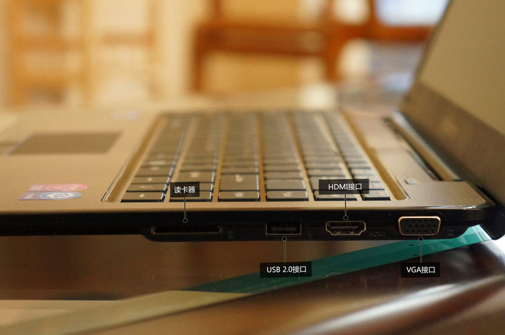 右端配备了多合一读卡器、1个USB2.0接口、1和HDMI接口和1个VGA接口。不过遗憾的是3个USB接口中没有一个USB3.0接口。15/18