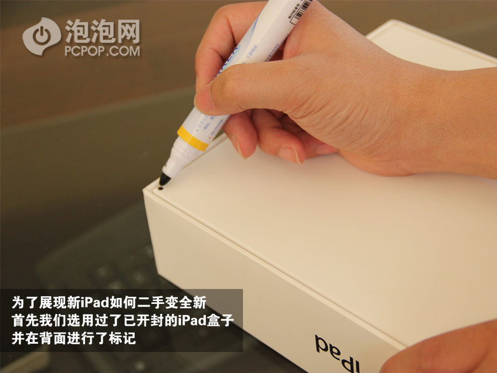 首先我们准备了一个已经拆封过的港行新iPad,而后在它的包装盒上面用笔进行了标记,稍后我们要做的就是将它重新封装,使它变成全新的“新iPad”。3/15