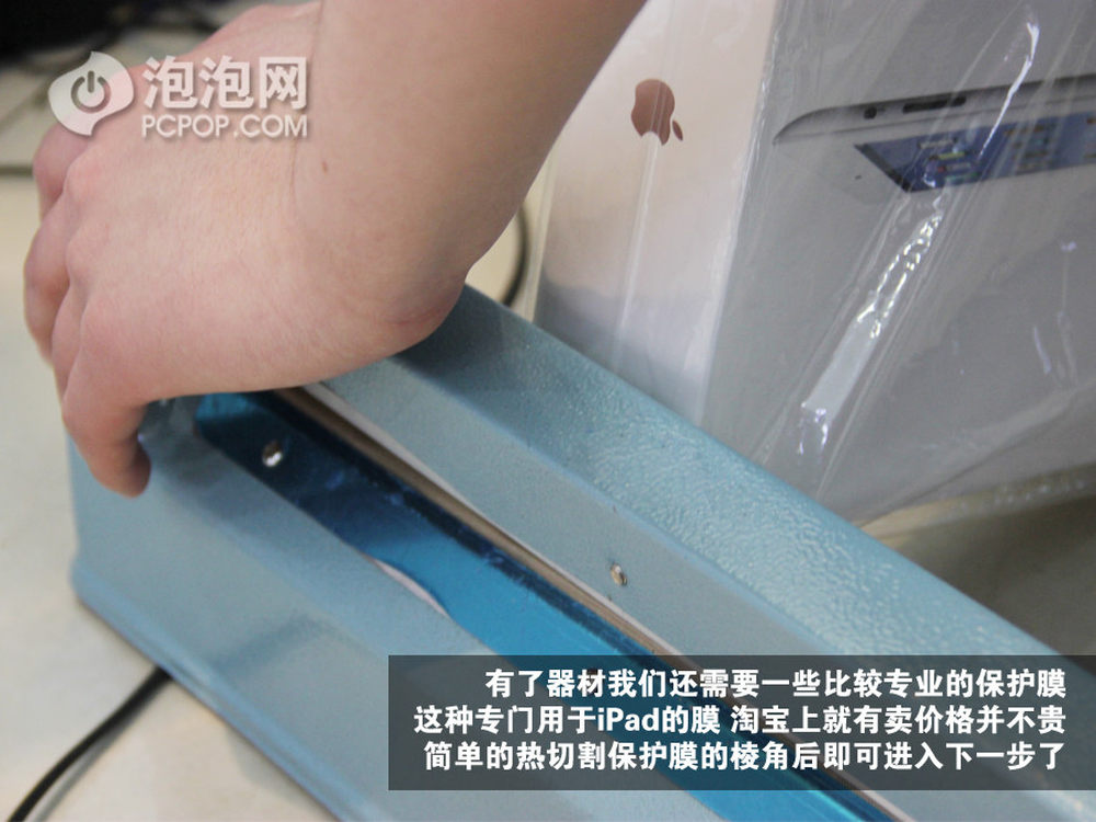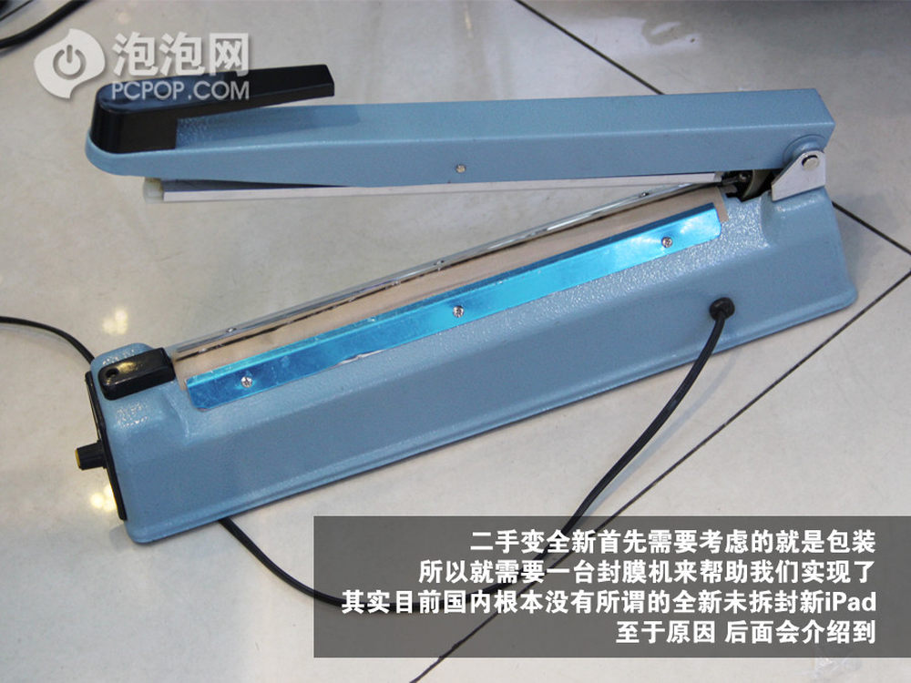 封装已经拆封的新iPad需要用到封膜机,其实就是用简单的热切割原理切割iPad包装上所用的保护膜。这种东西在淘宝上可以买到,售价不到两百块,是最常见到的封膜工具。4/15