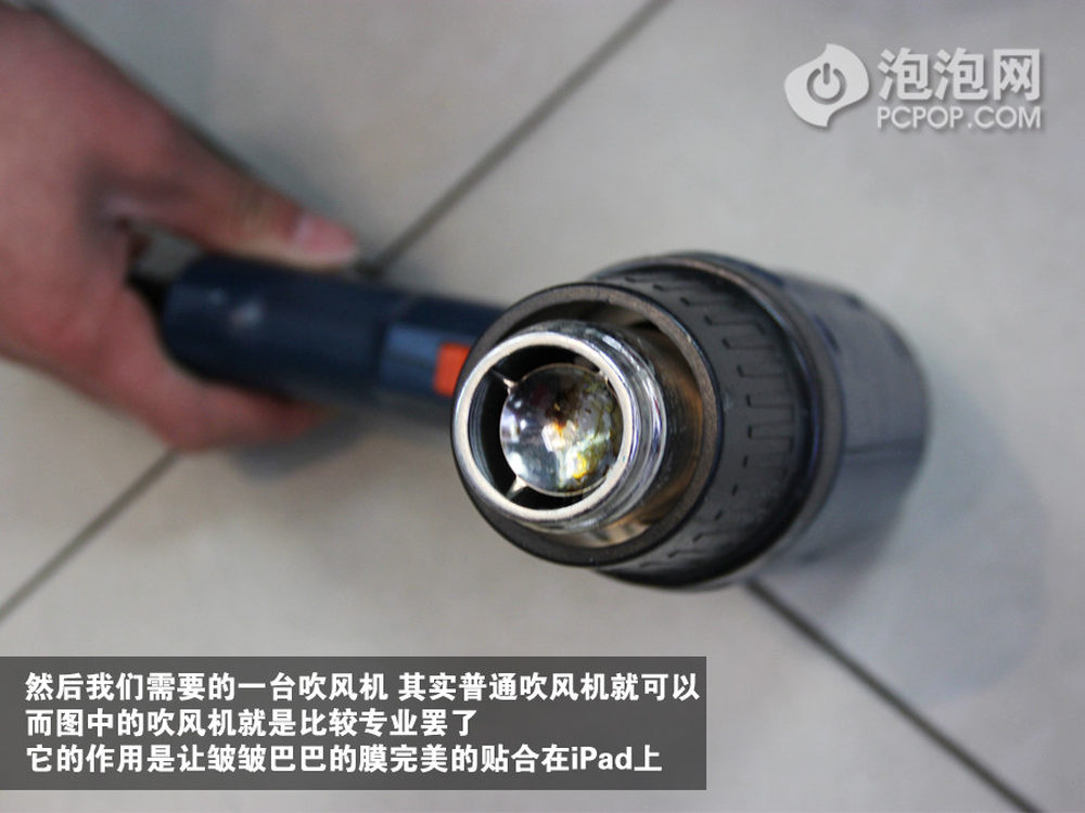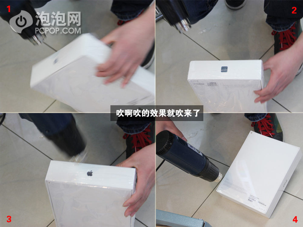 第二部就比较关键了,由于封膜机只能进行热切割,所以比较大的保护膜肯定会皱皱巴巴的。而第二步就要用到比较特别的电热枪咯!通过它就可以让已经开封的iPad变得跟全新的一样了。6/15