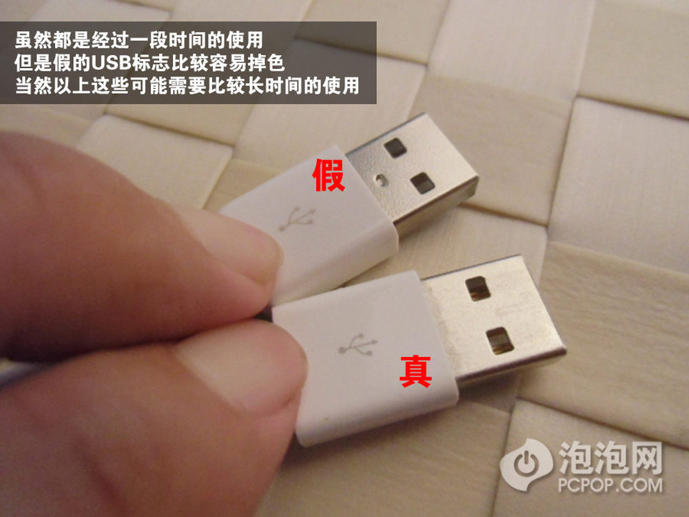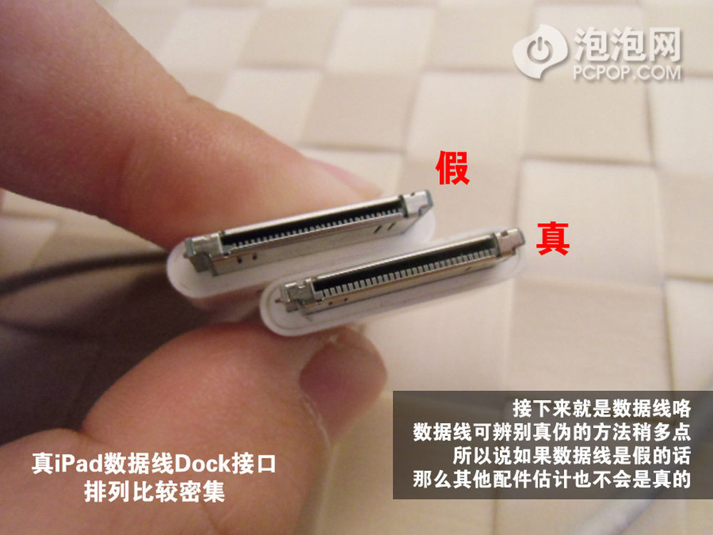 iPad数据线在USB端的手柄处会有标识,原装的数据线非常清晰,而假的则相对差一些。另外,同样一些仿真度比较高的,就只能悲剧的使一段时间才能发现咯!
