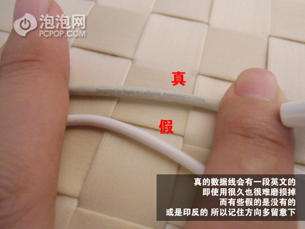 山寨或是假冒的iPad数据线就没有这么好了,很多数据线上都没有这段英文,而一些有的,却印反了方向。当然,也有一些仿真度比较高的,那种数据线在使用一段时间后英文会被磨掉,买的时候比较难以辨认。13/15