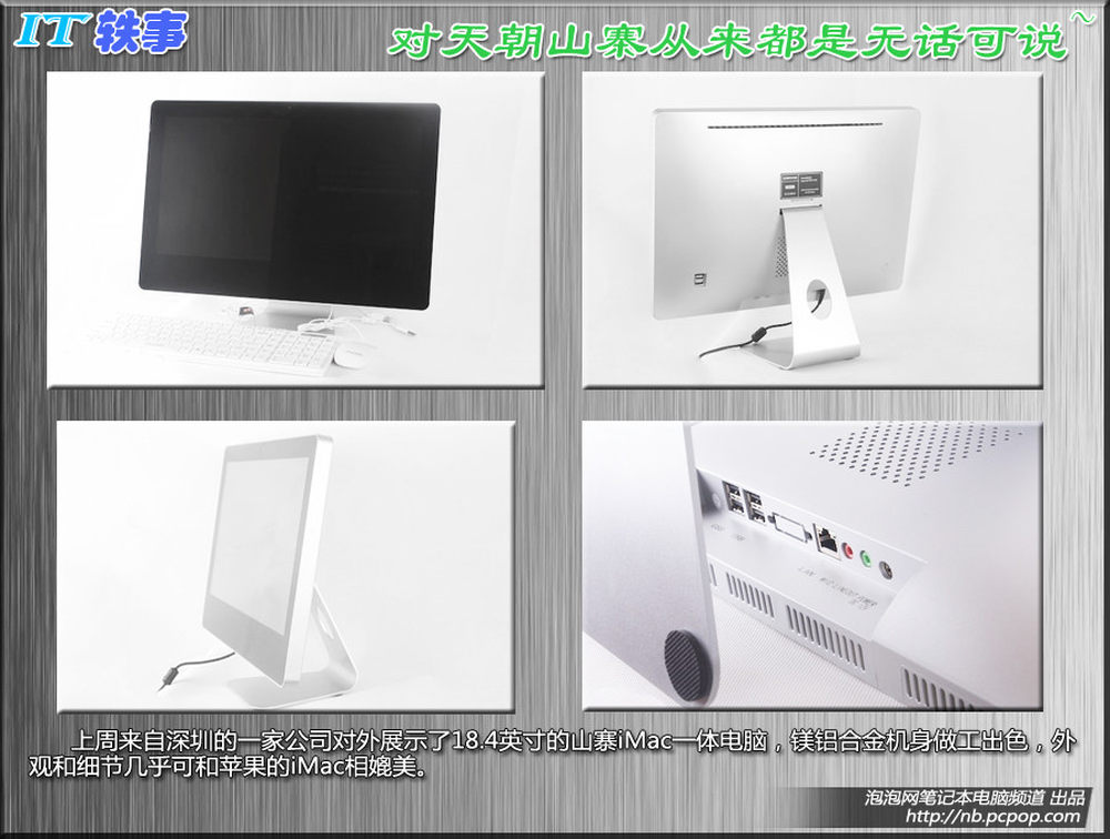 上周来自深圳的一家公司对外展示了18.4英寸的山寨iMac一体电脑,镁铝合金机身做工出色,外观和细节几乎可和苹果的iMac相媲美。<br />