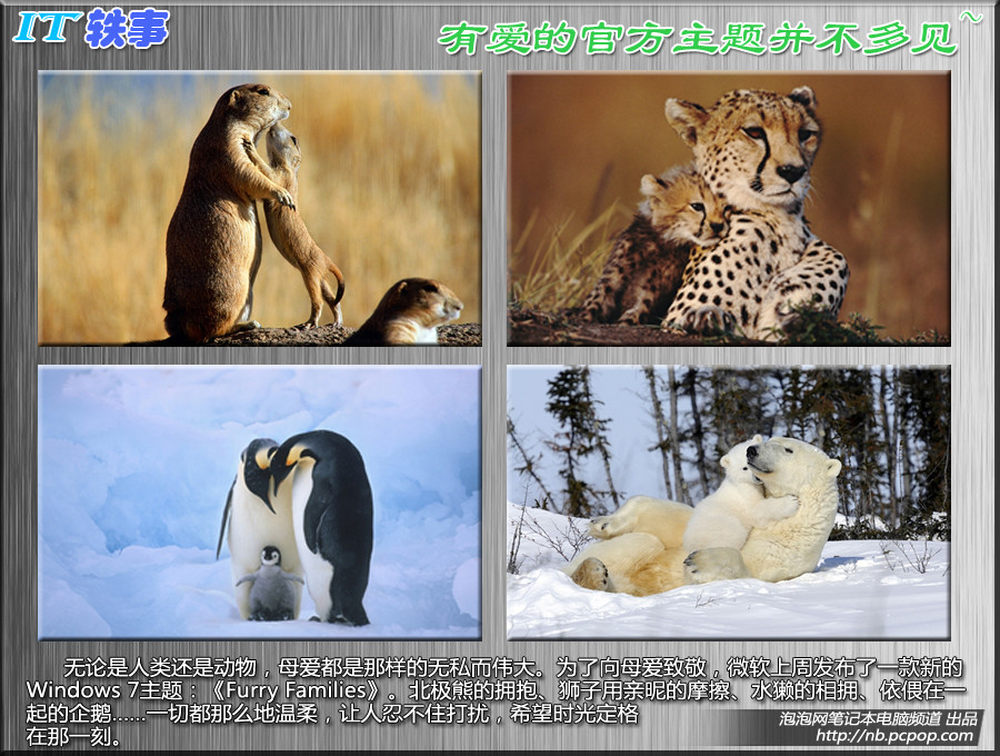 <p>无论是人类还是动物,母爱都是那样的无私而伟大。为了向母爱致敬,为你的桌面增添一缕温情,微软今天发布了一款Windows 7主题:《Furry Families》。北极熊的拥抱、狮子用亲昵的摩擦、水獭的相拥、依偎在一起的企鹅……一切都那么地温柔,让人忍不住打扰,希望时光定格在那一刻。</p>