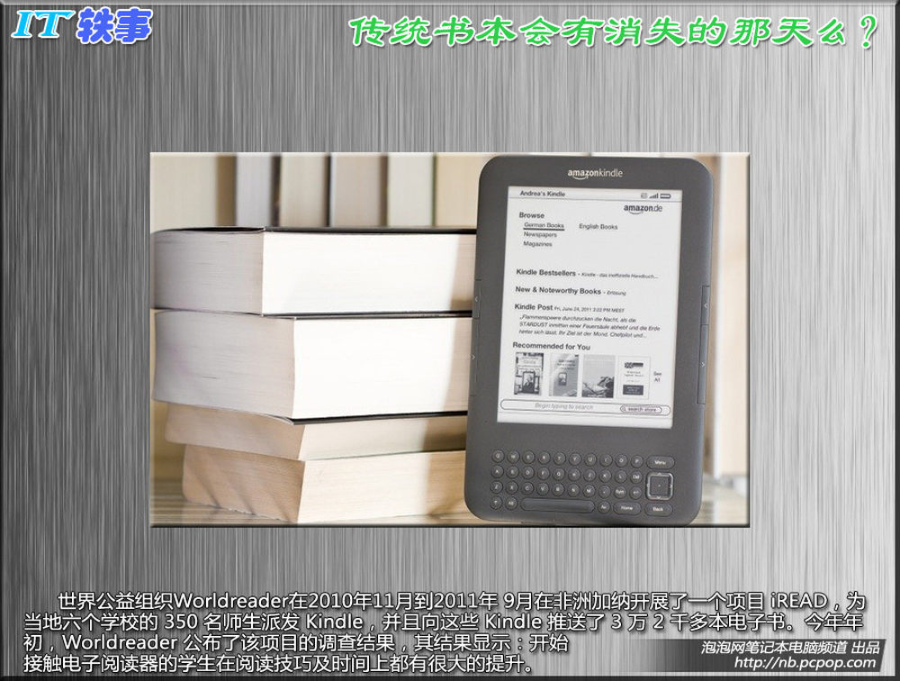 世界公益组织Worldreader 在 2010年11月到 2011年9月在非洲加纳开展了一个项目iREAD,为当地六个学校的350名师生派发Kindle,并且向这些 Kindle 推送了3万2千多本电子书。今年年初Worldreader公布了该项目的调查结果,其结果显示:开始接触电子阅读器的学生在阅读技巧及时间上都有很大的提升。6/11