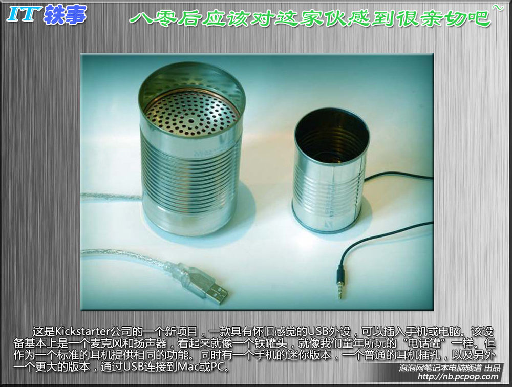 这是Kickstarter公司的一个新项目,一款具有怀旧感觉的USB外设,可以插入手机或电脑。该设备基本上是一个麦克风和扬声器,看起来就像一个铁罐头,就像我们童年所玩的“电话罐”一样。但作为一个标准的耳机提供相同的功能。同时有一个手机的迷你版本,一个普通的耳机插孔,以及另外一个更大的版本,通过USB连接到Mac或PC。7/11
