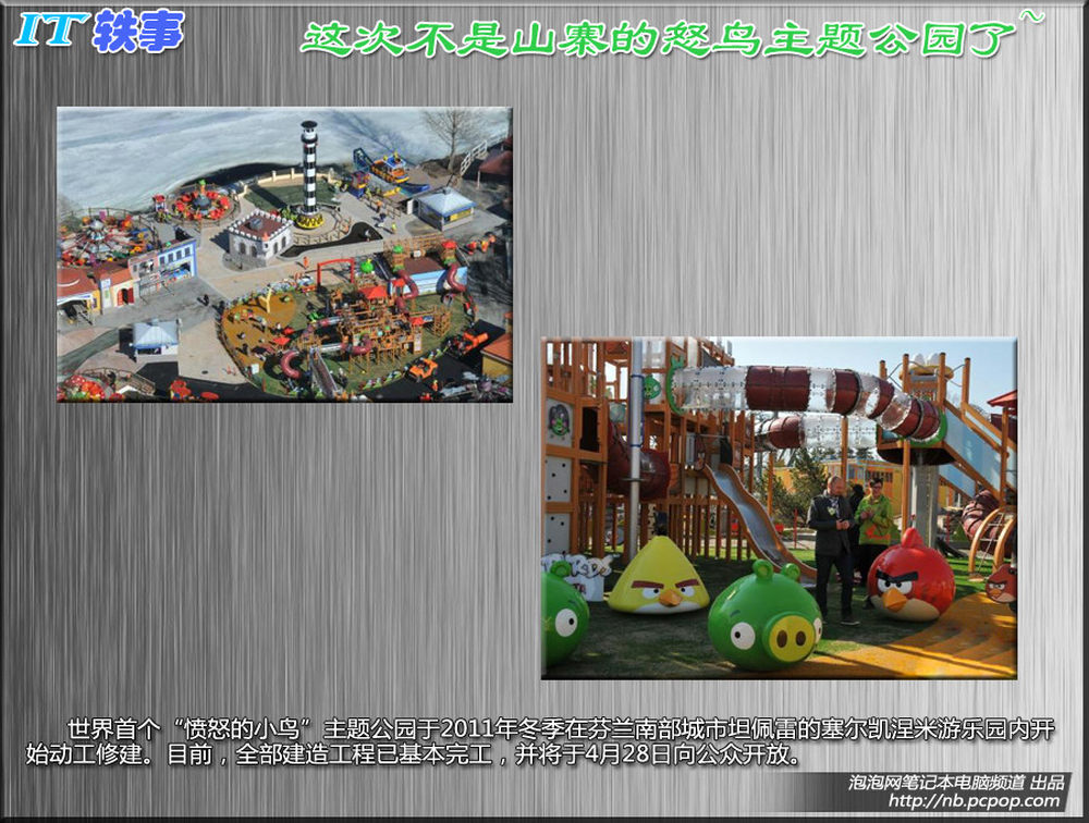 世界首个“愤怒的小鸟”主题公园于2011年冬季在芬兰南部城市坦佩雷的塞尔凯涅米游乐园内开始动工修建。目前,全部建造工程已基本完工,并将于4月28日向公众开放。8/11