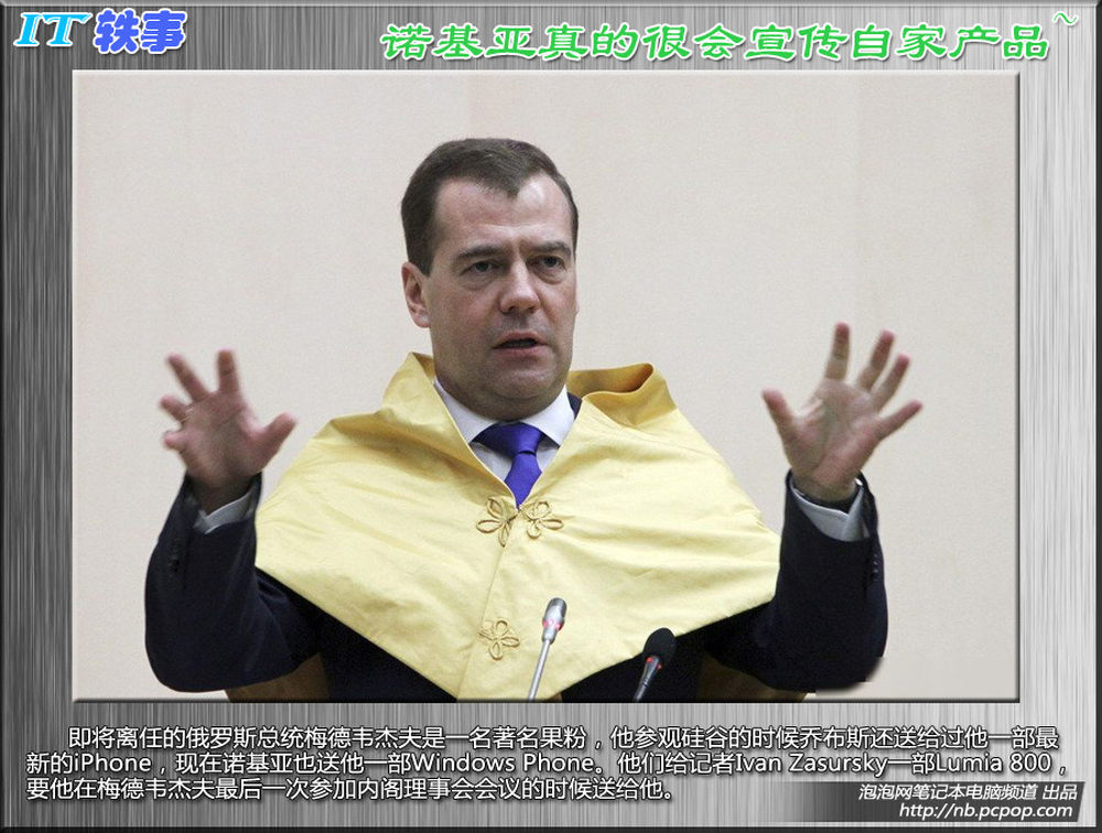 即将离任的俄罗斯总统梅德韦杰夫是一名著名果粉,他参观硅谷的时候乔布斯还送给过他一部iPhone,现在诺基亚也送他一部Windows Phone。他们给记者Ivan Zasursky一部Lumia 800,要他在梅德韦杰夫最后一次参加内阁理事会会议的时候送给他。9/11