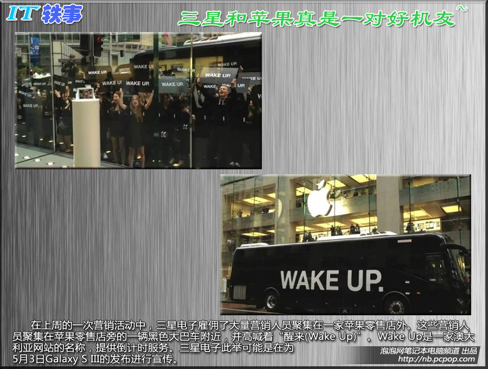 在上周的一次营销活动中,三星电子雇佣了大量营销人员聚集在一家苹果零售店外。这些营销人员聚集在苹果零售店旁的一辆黑色大巴车附近,并高喊着“醒来(Wake Up)”。Wake Up是一家澳大利亚网站的名称,提供倒计时服务。三星电子此举可能是在为5月3日Galaxy S III的发布进行宣传。10/11