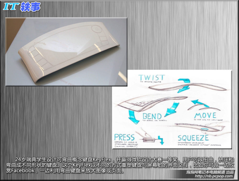 24岁瑞典学生设计可弯曲概念键盘KeyFlex,并赢得微软设计大赛一等奖。用户可以扭曲,挤压和弯曲成不同形状的键盘。这个KeyFlex以不同的方式重塑键盘与屏幕上的界面交互,比如你可以一边欣赏Facebook,一边利用弯曲键盘来放大图像或页面。11/11