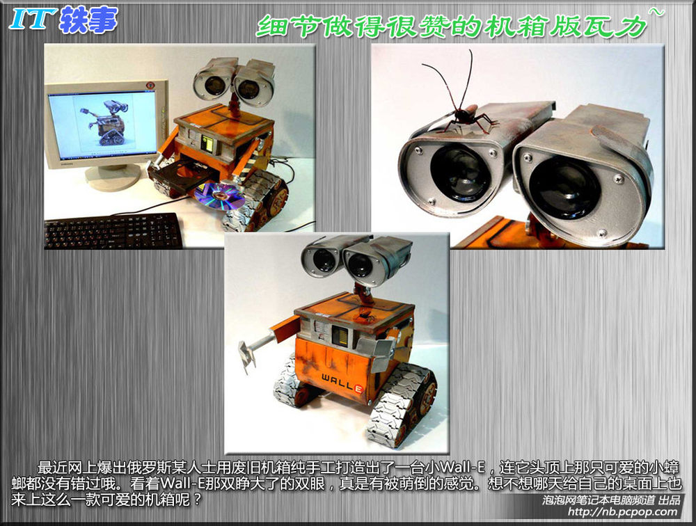 <p>最近网上爆出俄罗斯某人士用废旧机箱纯手工打造出了一台小Wall-E,连它头顶上那只可爱的小蟑螂都没有错过哦。看着Wall-E那双睁大了的双眼,真是有被萌倒的感觉。想不想哪天给自己的桌面上也来上这么一款可爱的机箱呢?</p>