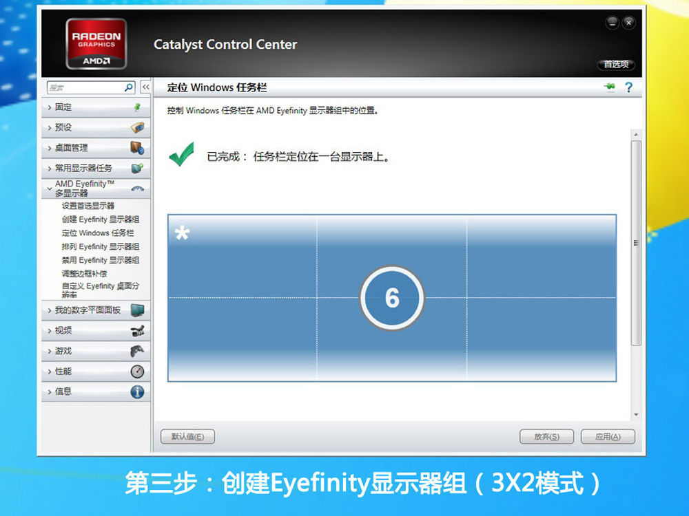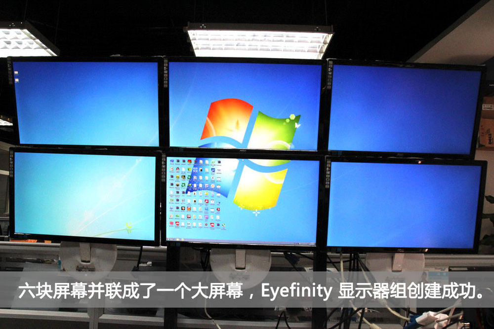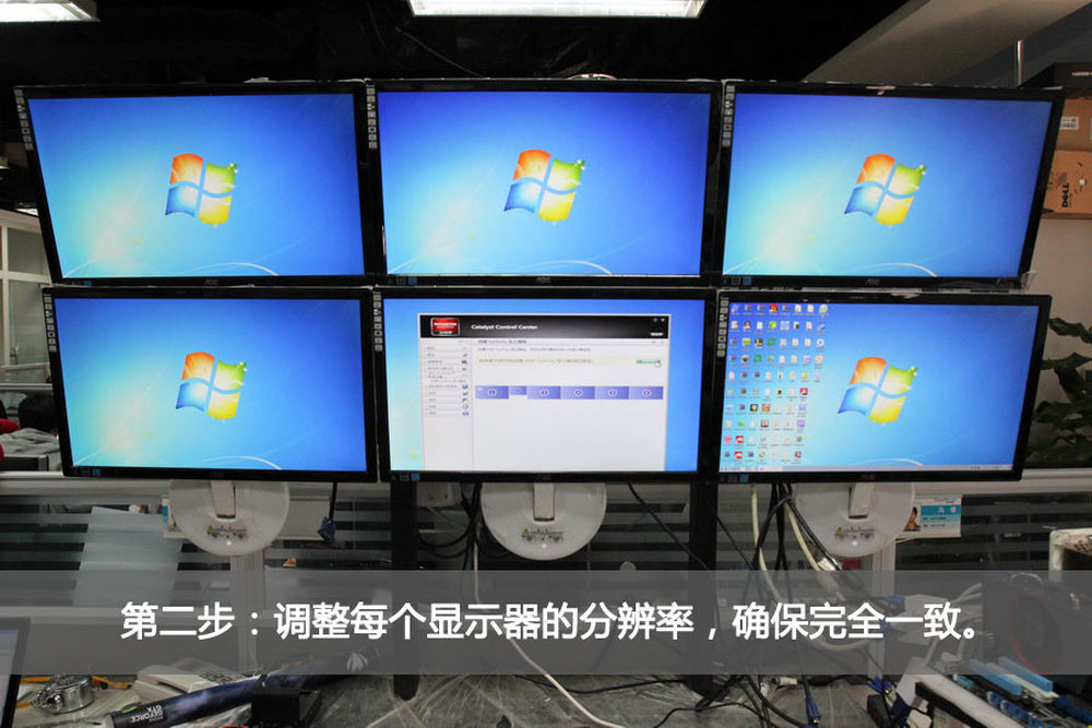 很简单吧,只需要三步就可以轻松搞定六屏,不过这里需要注意,一定要安装最新通过认证的显卡催化剂和驱动控制中心,个别预览版或者老版本的驱动对六屏的支持并不是非常好,可能会出现第六个屏点不亮的情况。8/21