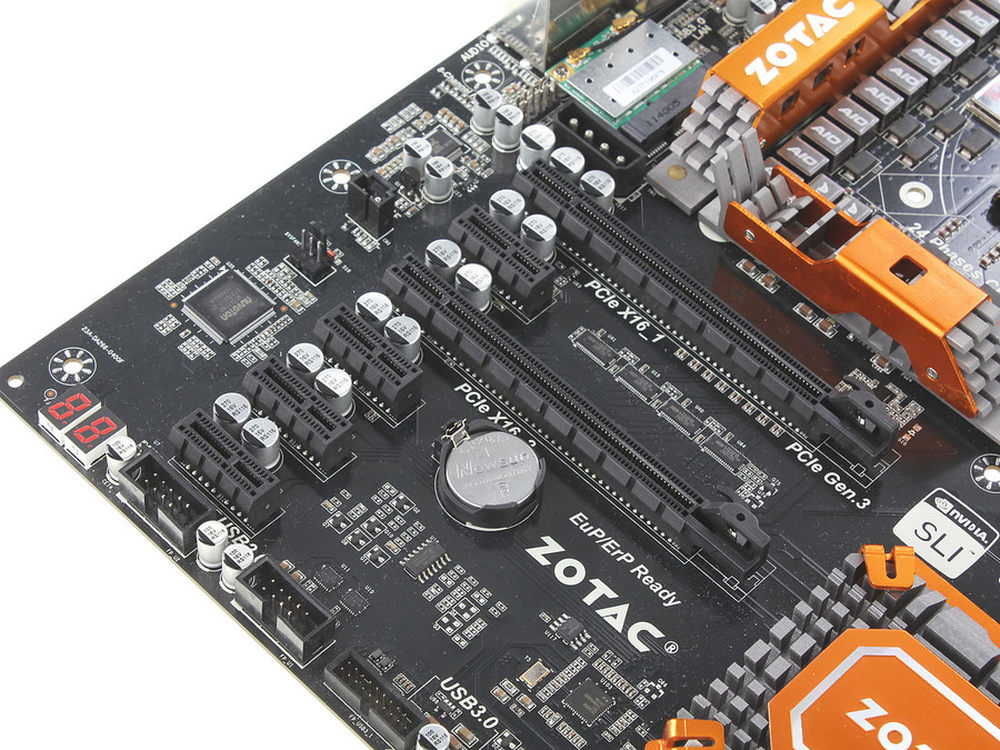 索泰ZT-Z77皇冠版-U1D配备了两条PCI-Express 3.0插槽,速度将比2.0插槽快一倍左右!特别是搭配高速双显卡的情况下,双卡数据交换更加顺畅,效率发挥更加出色。4/13
