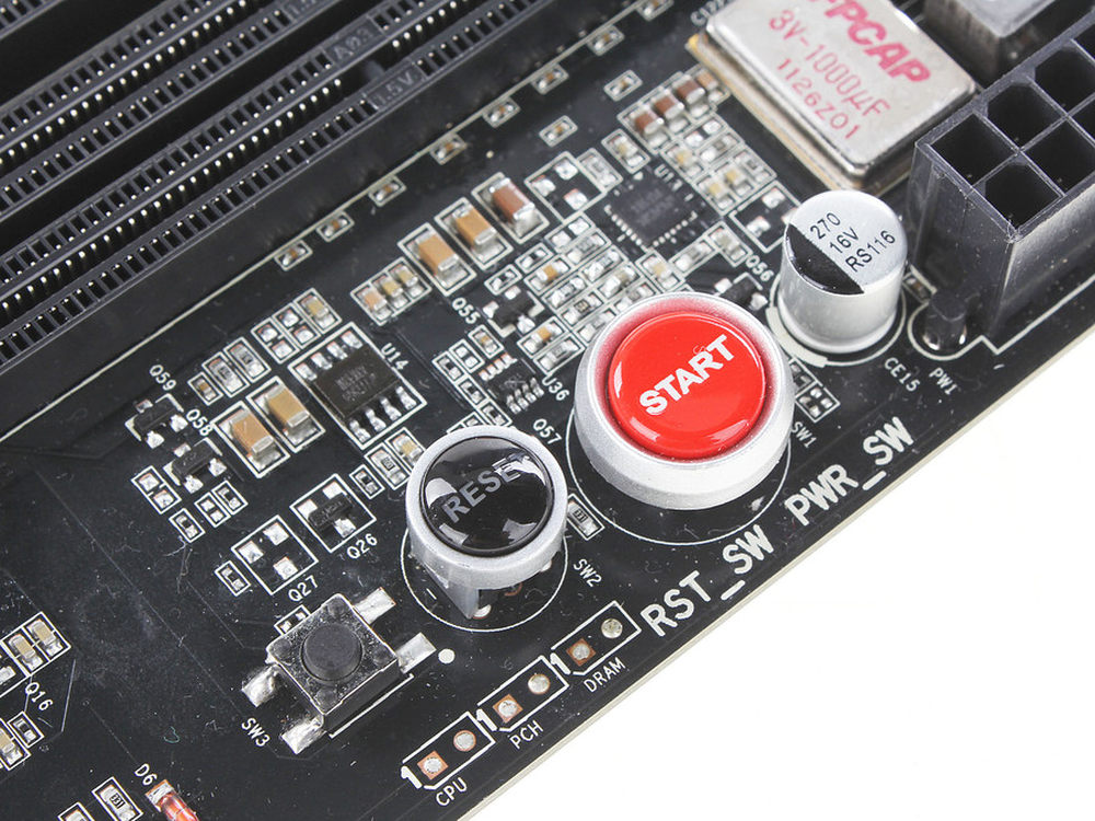 <p>为了方便裸台使用,主板上还融入了不少DIY玩家元素,主板的开关机、重启以及清除CMOS都做成按钮式被放置在主控右侧,旁边还有电压监测点与LED指示灯,方便DIY玩家监控主板运行情况。</p>10/13